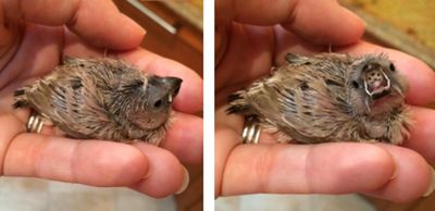 Beginning at 1-1.5 weeks I will hand feed the babies inside the enclosure nest on occasion (usually 3 times a day) to relieve the burden off of the mother. At this age they do not have feathers, and are very fragile. They must remain in their mothers care until they have pin feathers.